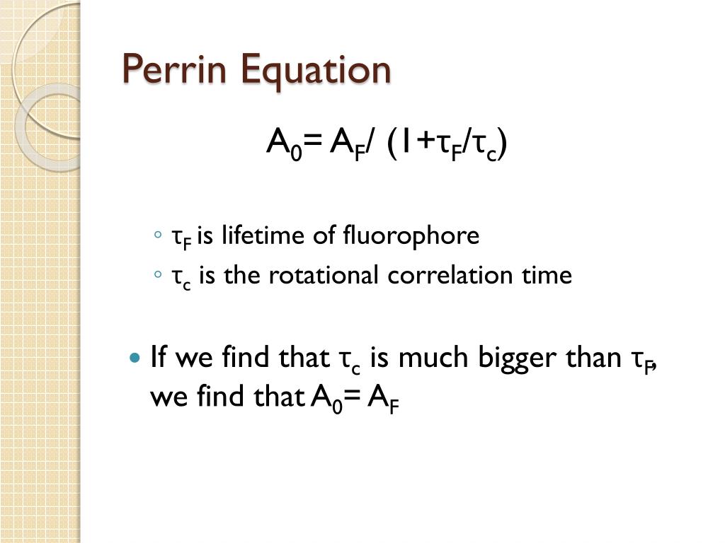 Perrin Equation A0= AF/ (1+τF/τc) • τF is lifetime of fluorophore • τc is the rotational correlation time • If we find that τc is much bigger than τF, we find that A0= AF