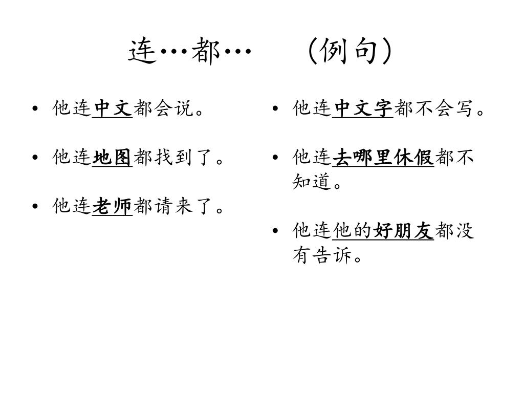 连…都… (例句) • 他连中文都会说。 • 他连地图都找到了。 • 他连老师都请来了。 • 他连中文字都不会写。 • 他连去哪里休假都不知道。 • 他连他的好朋友都没有告诉。