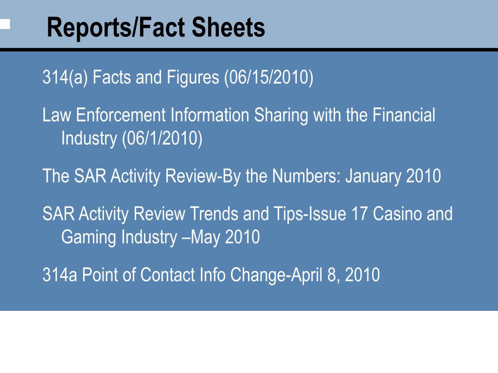 Reports/Fact Sheets • 314(a) Facts and Figures (06/15/2010) • Law Enforcement Information Sharing with the Financial Industry (06/1/2010) • The SAR Activity Review-By the Numbers: January 2010 • SAR Activity Review Trends and Tips-Issue 17 Casino and Gaming Industry –May 2010 • 314a Point of Contact Info Change-April 8, 2010