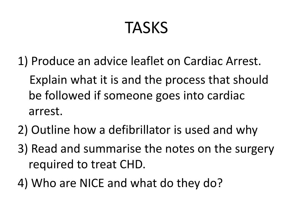 TASKS 1) Produce an advice leaflet on Cardiac Arrest. Explain what it is and the process that should be followed if someone goes into cardiac arrest. 2) Outline how a defibrillator is used and why 3) Read and summarise the notes on the surgery required to treat CHD. 4) Who are NICE and what do they do?