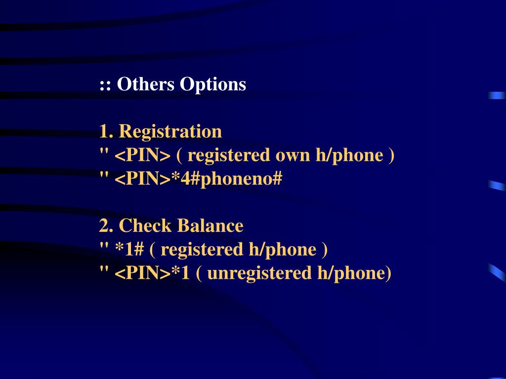 :: Others Options 1. Registration" <PIN> ( registered own h/phone )" <PIN>*4#phoneno#2. Check Balance" *1# ( registered h/phone )" <PIN>*1 ( unregistered h/phone)