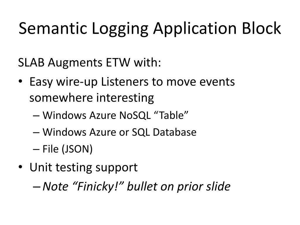 Semantic Logging Application Block SLAB Augments ETW with: • Easy wire-up Listeners to move events somewhere interesting • Windows Azure NoSQL “Table” • Windows Azure or SQL Database • File (JSON) • Unit testing support • Note “Finicky!” bullet on prior slide