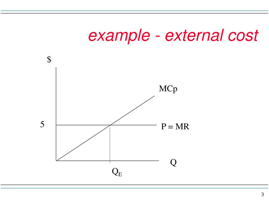 example - external cost On the previous screen we have an example of a competitive firm in the candy market and the competitive price is $5 (remember competitive firms are price takers). The firm’s MC is labeled MCp for private marginal cost. The candy maker imposes costs on a doctor’s office due to the noise from making the candy, but the external cost is not shown yet. If left alone, the firm will produce the amount QE, where MR = MCp.
