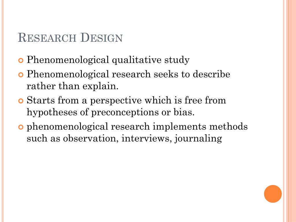 Research Design • Phenomenological qualitative study • Phenomenological research seeks to describe rather than explain. • Starts from a perspective which is free from hypotheses of preconceptions or bias. • phenomenological research implements methods such as observation, interviews, journaling