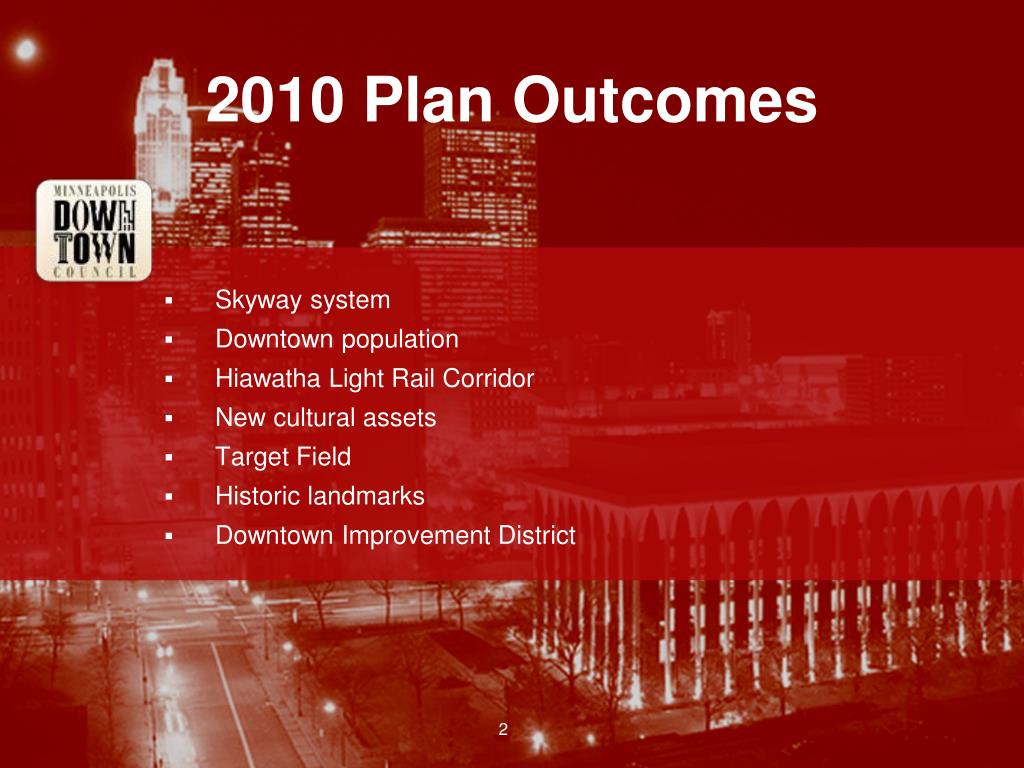 Skyway system • Downtown population • Hiawatha Light Rail Corridor • New cultural assets • Target Field • Historic landmarks • Downtown Improvement District 2010 Plan Outcomes 2