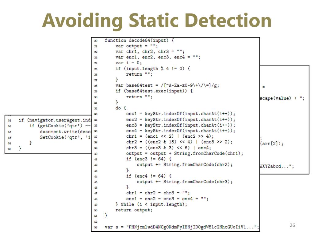 Environment Fingerprinting Prevents Detection Nozzle Zozzle <script> var adobe=new ActiveXObject(‘AcroPDF.PDF’); var adobeVersion=adobe.GetVariable (‘$version’); if (navigator.userAgent.indexOf(‘IE 6’)>=0 && adobeVersion == ’9.1.3’) { var x=unescape(‘%u4149%u1982%u90 […]’); eval(x); }</script> • In 7.7% of JS files, code getsa reference to environment • In 1.2%, code branches on such sensitive values • 89.5% of malicious JS branches on such values <script> if (navigator.userAgent.indexOf(‘IE 6’)>=0) { var x=unescape(‘%u4149%u1982%u90 […]’); eval(x); }</script> Is this a practical problem for our malware detectors?
