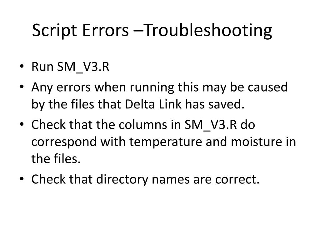 Script Errors –Troubleshooting • Run SM_V3.R • Any errors when running this may be caused by the files that Delta Link has saved. • Check that the columns in SM_V3.R do correspond with temperature and moisture in the files. • Check that directory names are correct.