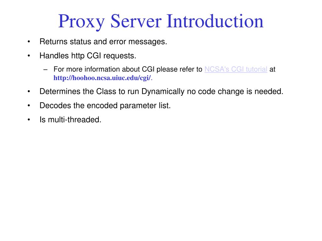 Web Proxy Server. Proxy Server Introduction. Returns status and error messages. Handles http CGI requests. For more information about CGI please refer to NCSA's CGI tutorial at http://hoohoo.ncsa.uiuc.edu/cgi/ . Determines the Class to run Dynamically no code change is needed.
