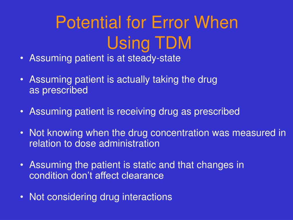 Potential for Error When Using TDM • Assuming patient is at steady-state • Assuming patient is actually taking the drug as prescribed • Assuming patient is receiving drug as prescribed • Not knowing when the drug concentration was measured inrelation to dose administration • Assuming the patient is static and that changes in condition don’t affect clearance • Not considering drug interactions