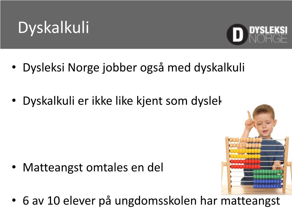 Dyskalkuli • DysleksiNorge jobber også med dyskalkuli • Dyskalkulierikke like kjentsomdysleksi • Matteangstomtales en del • 6 av 10 eleverpåungdomsskolenharmatteangst