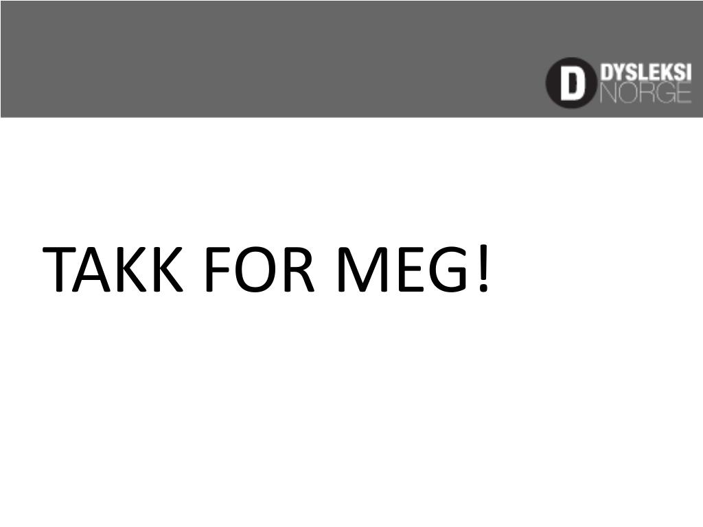 KJENNETEGN… • …påskrivevansker: • Dobbelt konsonant (man = mann, forberredt = forberedt) • Bokstavene bytter plass (klarte = klatre, starks = straks) • Sammensatte ord (motor sykkel = motorsykkel) • Bokstaver utelates i ord (væreser = værelser, midt = mitt) • Ordet skrives lydrett (domme = dumme, gjærne = gjerne)