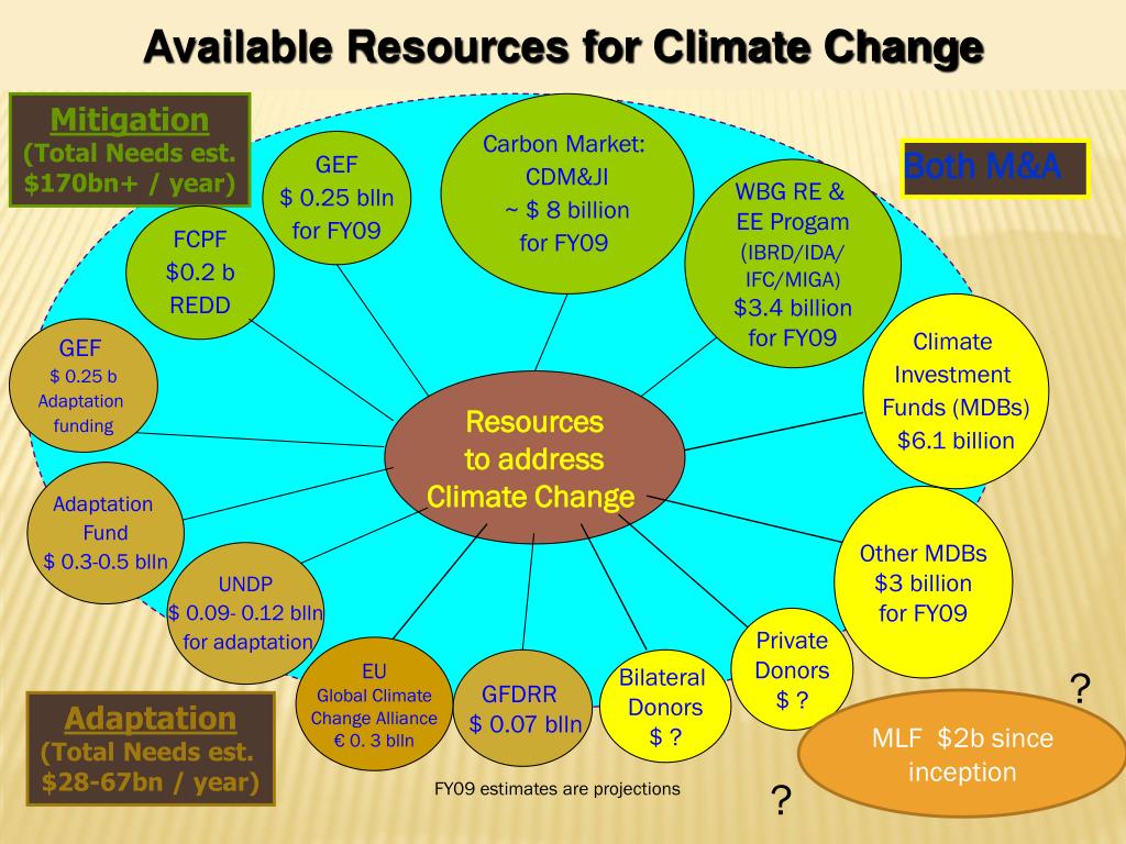 Available Resources for Climate Change Carbon Market: CDM&JI ~ $ 8 billion for FY09 GEF $ 0.25 blln for FY09 Both M&A WBG RE & EE Progam (IBRD/IDA/ IFC/MIGA) $3.4 billion for FY09 FCPF $0.2 b REDD Climate Investment Funds (MDBs) $6.1 billion GEF $ 0.25 b Adaptation funding Adaptation Fund $ 0.3-0.5 blln Other MDBs$3 billionfor FY09 UNDP $ 0.09- 0.12 blln for adaptation PrivateDonors$ ? EUGlobal ClimateChange Alliance€ 0. 3 blln GFDRR $ 0.07 blln Bilateral Donors$ ? Adaptation(Total Needs est. $28-67bn / year) Mitigation(Total Needs est.$170bn+ / year) Resourcesto addressClimate Change ? MLF $2b since inception ? FY09 estimates are projections