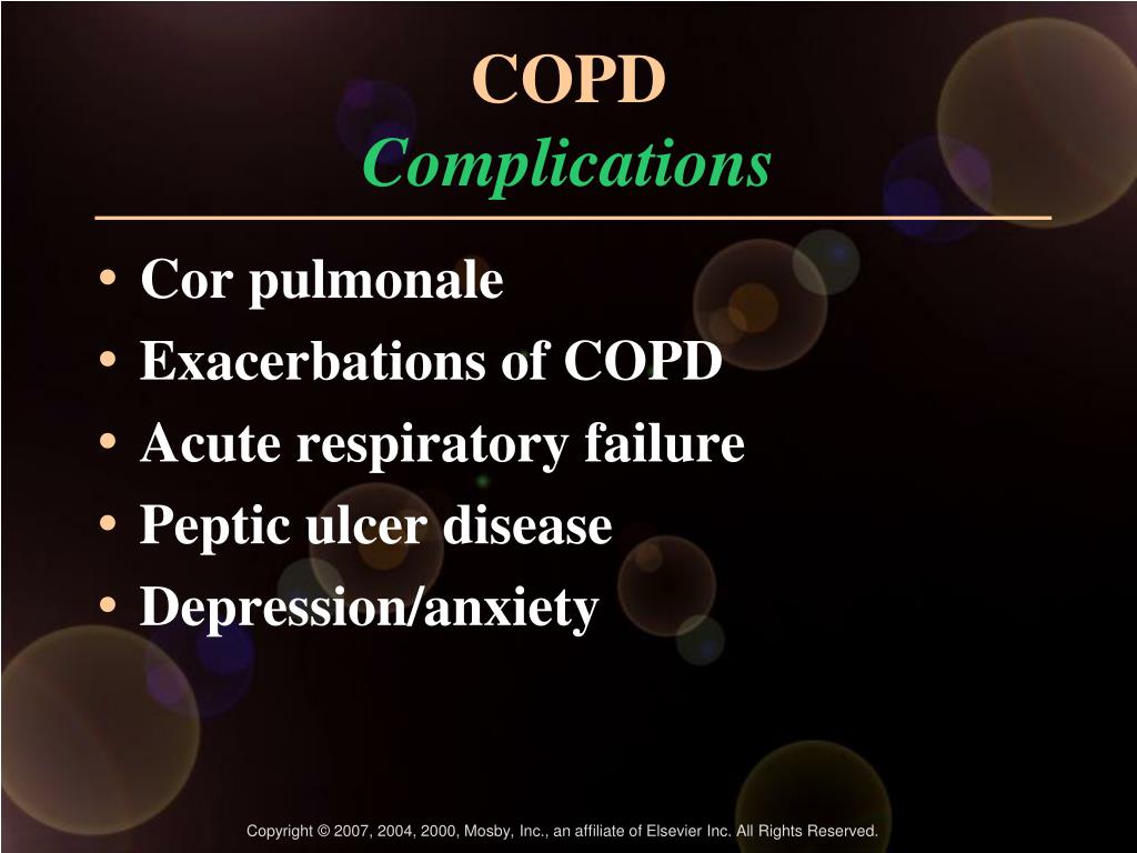 COPD Complications • Cor pulmonale • Exacerbations of COPD • Acute respiratory failure • Peptic ulcer disease • Depression/anxiety