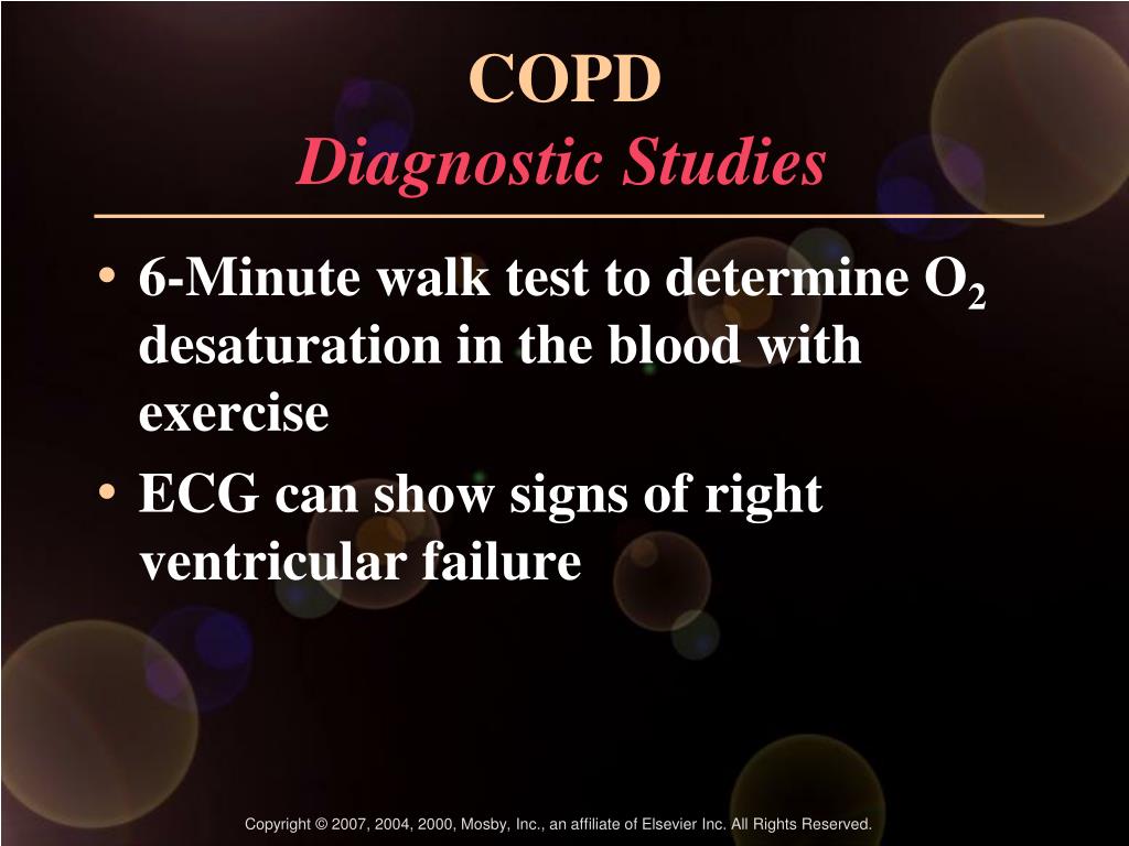 COPD Diagnostic Studies • 6-Minute walk test to determine O2 desaturation in the blood with exercise • ECG can show signs of right ventricular failure