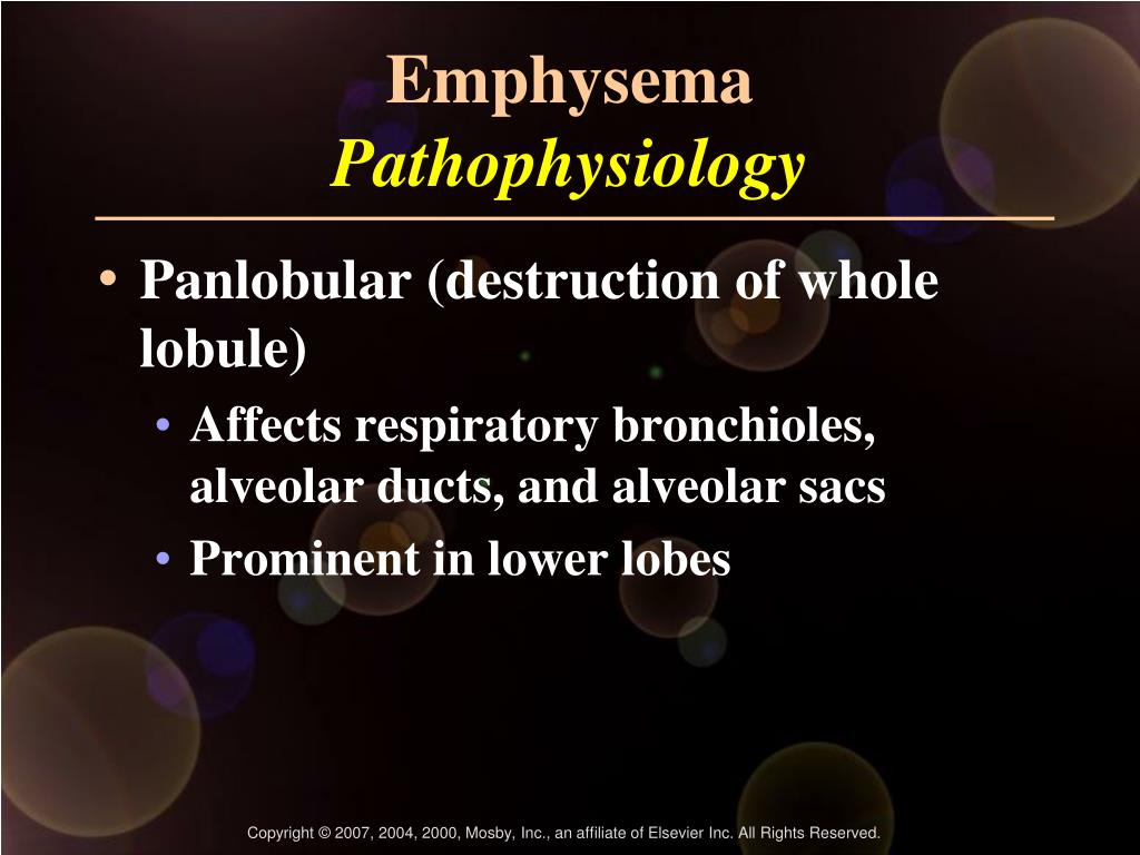 EmphysemaPathophysiology • Panlobular (destruction of whole lobule) • Affects respiratory bronchioles, alveolar ducts, and alveolar sacs • Prominent in lower lobes