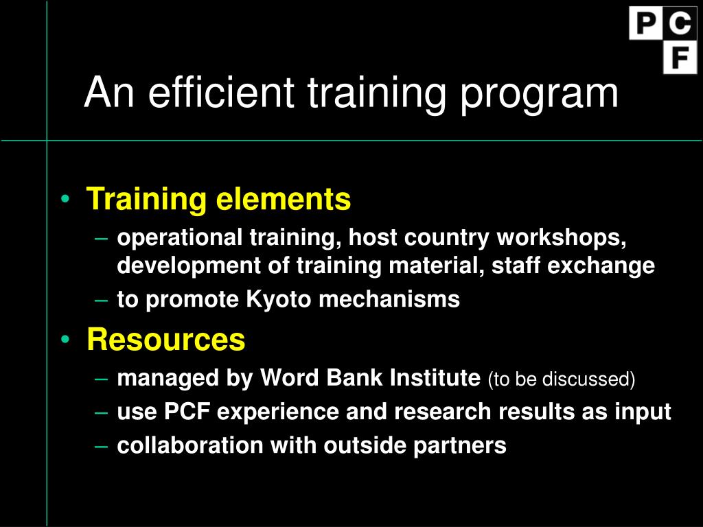 An efficient training program • Training elements • operational training, host country workshops, development of training material, staff exchange • to promote Kyoto mechanisms • Resources • managed by Word Bank Institute (to be discussed) • use PCF experience and research results as input • collaboration with outside partners