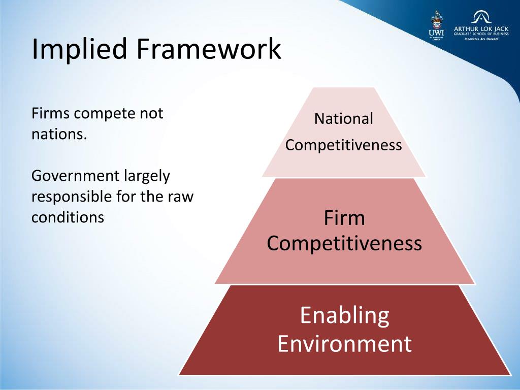 Implied Framework Firms compete not nations. Government largely responsible for the raw conditions