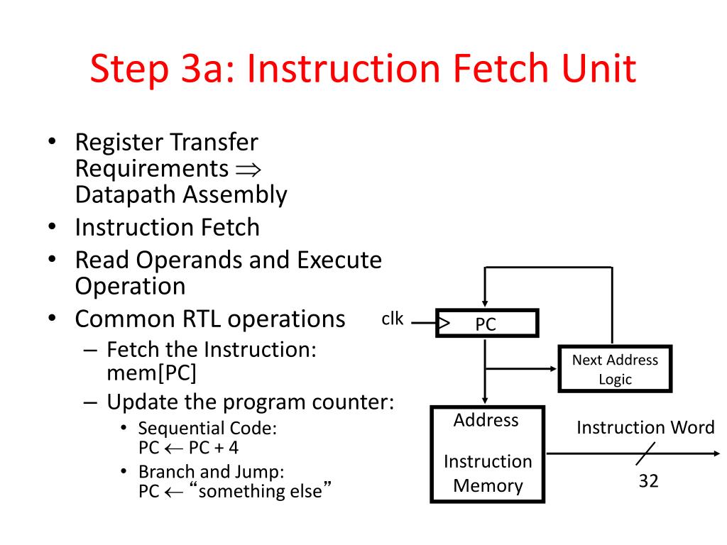 Next Address Logic Address Instruction Memory Step 3a: Instruction Fetch Unit • Register Transfer Requirements Datapath Assembly • Instruction Fetch • Read Operands and Execute Operation • Common RTL operations • Fetch the Instruction: mem[PC] • Update the program counter: • Sequential Code: PC PC + 4 • Branch and Jump: PC “something else” clk PC Instruction Word 32