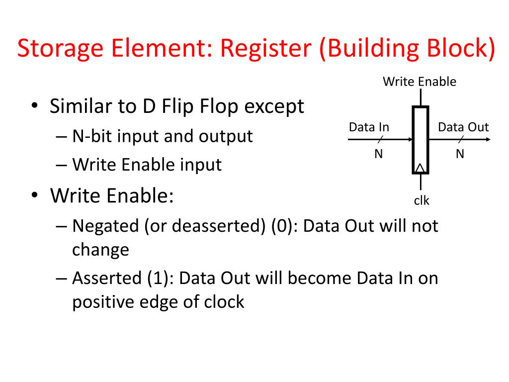 Write Enable Data In Data Out N N clk Storage Element: Register (Building Block) • Similar to D Flip Flop except • N-bit input and output • Write Enable input • Write Enable: • Negated (or deasserted) (0): Data Out will not change • Asserted (1): Data Out will become Data In on positive edge of clock
