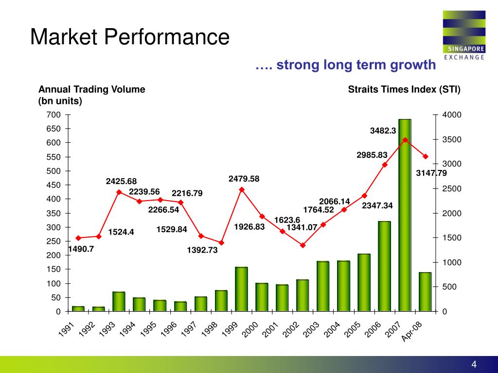 Market Performance …. strong long term growth Annual Trading Volume (bn units) Straits Times Index (STI)