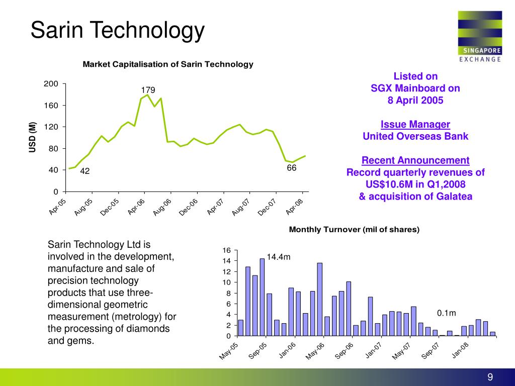 Sarin Technology Listed on SGX Mainboard on 8 April 2005 Issue Manager United Overseas Bank Recent Announcement Record quarterly revenues of US$10.6M in Q1,2008 & acquisition of Galatea 179 66 42 Sarin Technology Ltd is involved in the development, manufacture and sale of precision technology products that use three-dimensional geometric measurement (metrology) for the processing of diamonds and gems. 14.4m 0.1m
