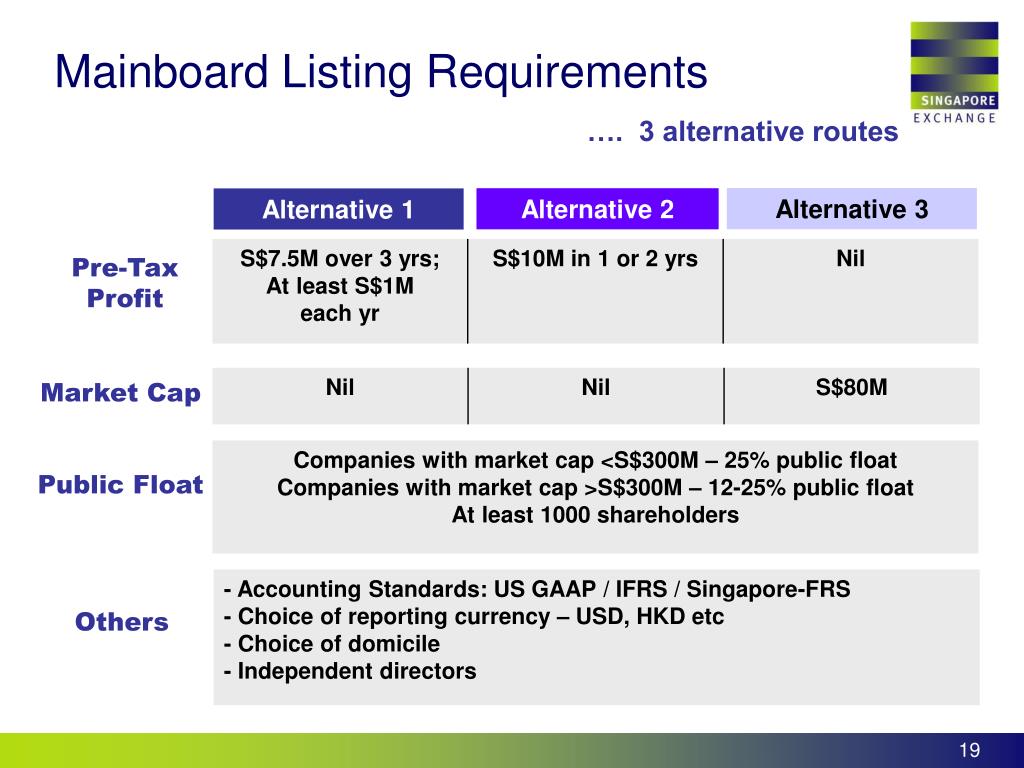 Mainboard Listing Requirements …. 3 alternative routes Alternative 3 Alternative 2 Alternative 1 Pre-Tax Profit Market Cap Public Float Others