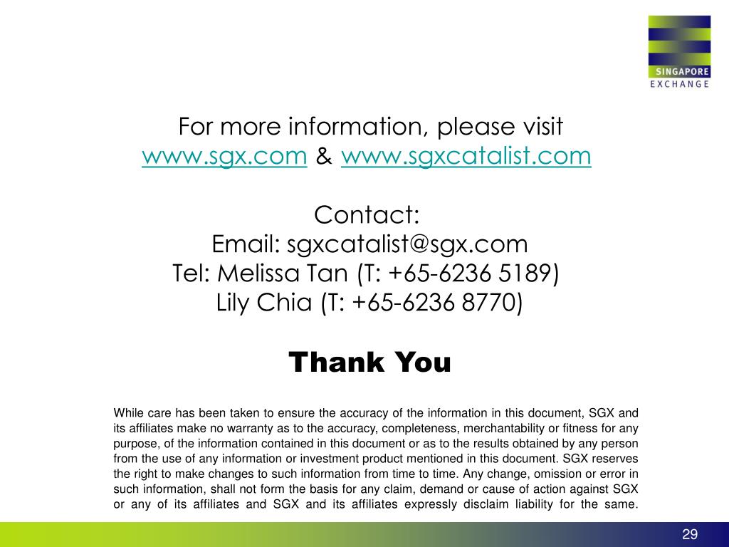 For more information,please visit www.sgx.com &www.sgxcatalist.comContact: Email: sgxcatalist@sgx.comTel: Melissa Tan (T: +65-6236 5189) Lily Chia (T: +65-6236 8770)Thank You While care has been taken to ensure the accuracy of the information in this document, SGX and its affiliates make no warranty as to the accuracy, completeness, merchantability or fitness for any purpose, of the information contained in this document or as to the results obtained by any person from the use of any information or investment product mentioned in this document. SGX reserves the right to make changes to such information from time to time. Any change, omission or error in such information, shall not form the basis for any claim, demand or cause of action against SGX or any of its affiliates and SGX and its affiliates expressly disclaim liability for the same.