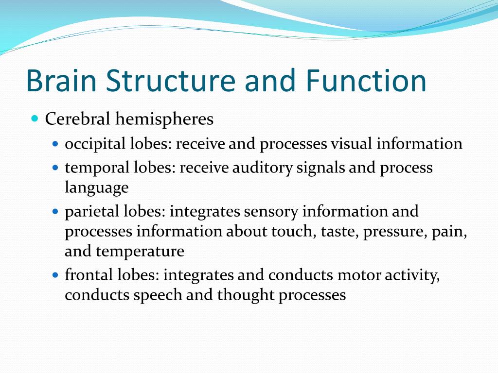 Brain Structure and Function • Cerebral hemispheres • occipital lobes: receive and processes visual information • temporal lobes: receive auditory signals and process language • parietal lobes: integrates sensory information and processes information about touch, taste, pressure, pain, and temperature • frontal lobes: integrates and conducts motor activity, conducts speech and thought processes