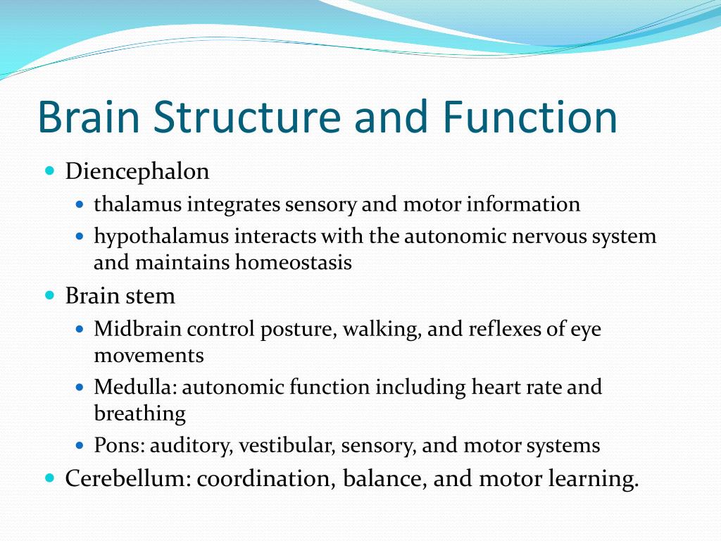Brain Structure and Function • Diencephalon • thalamus integrates sensory and motor information • hypothalamus interacts with the autonomic nervous system and maintains homeostasis • Brain stem • Midbrain control posture, walking, and reflexes of eye movements • Medulla: autonomic function including heart rate and breathing • Pons: auditory, vestibular, sensory, and motor systems • Cerebellum: coordination, balance, and motor learning.