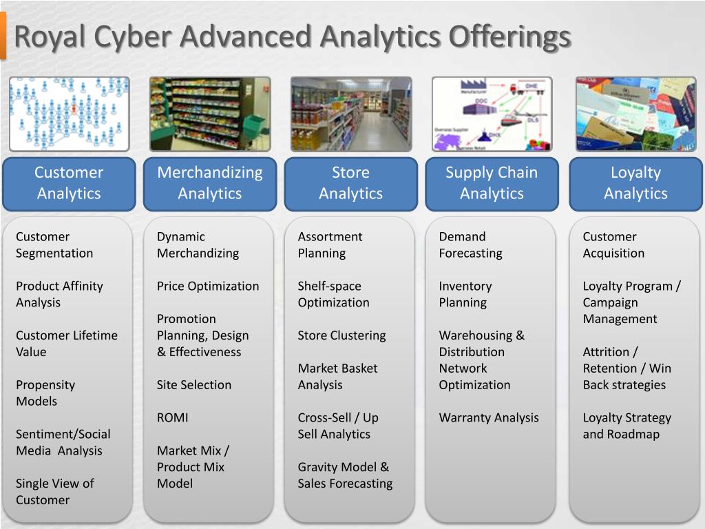 Royal Cyber Advanced Analytics Offerings Customer Analytics Merchandizing Analytics Store Analytics Supply Chain Analytics Loyalty Analytics Customer Segmentation Product Affinity Analysis Customer Lifetime Value Propensity Models Sentiment/Social Media Analysis Single View of Customer Dynamic Merchandizing Price Optimization Promotion Planning, Design & Effectiveness Site Selection ROMI Market Mix / Product Mix Model Assortment Planning Shelf-space Optimization Store Clustering Market Basket Analysis Cross-Sell / Up Sell Analytics Gravity Model & Sales Forecasting Demand Forecasting Inventory Planning Warehousing & Distribution Network Optimization Warranty Analysis Customer Acquisition Loyalty Program / Campaign Management Attrition / Retention / Win Back strategies Loyalty Strategy and Roadmap