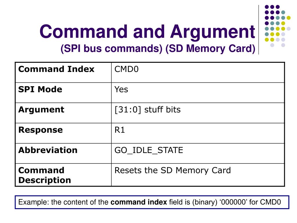 Command and Argument(SPI bus commands) (SD Memory Card) Example: the content of the command index field is (binary) ‘000000’ for CMD0