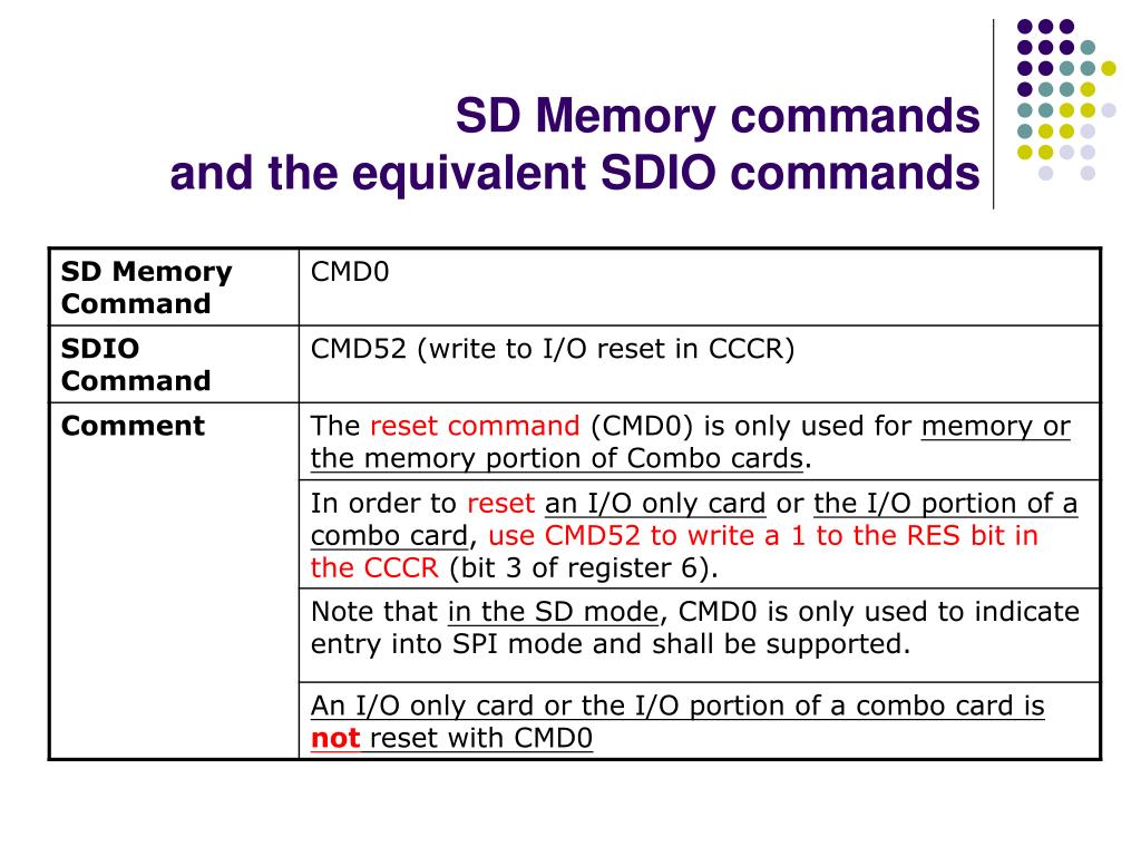 Reset for SDIO(CMD0) • In order to reset all functions within an SDIO card or the SDIO portion of a combo card, a method different than that used for SD memory is defined. • The reset command (CMD0) is only used for memory or the memory portion of Combo cards. In order to reset an I/O only card or the I/O portion of a combo card, use CMD52 to write a 1 to the RES bit in the CCCR (bit 3 of register 6). • Note that in the SD mode, CMD0 is only used to indicate entry into SPI mode and shall be supported. An I/O only card or the I/O portion of a combo card is not reset by CMD0