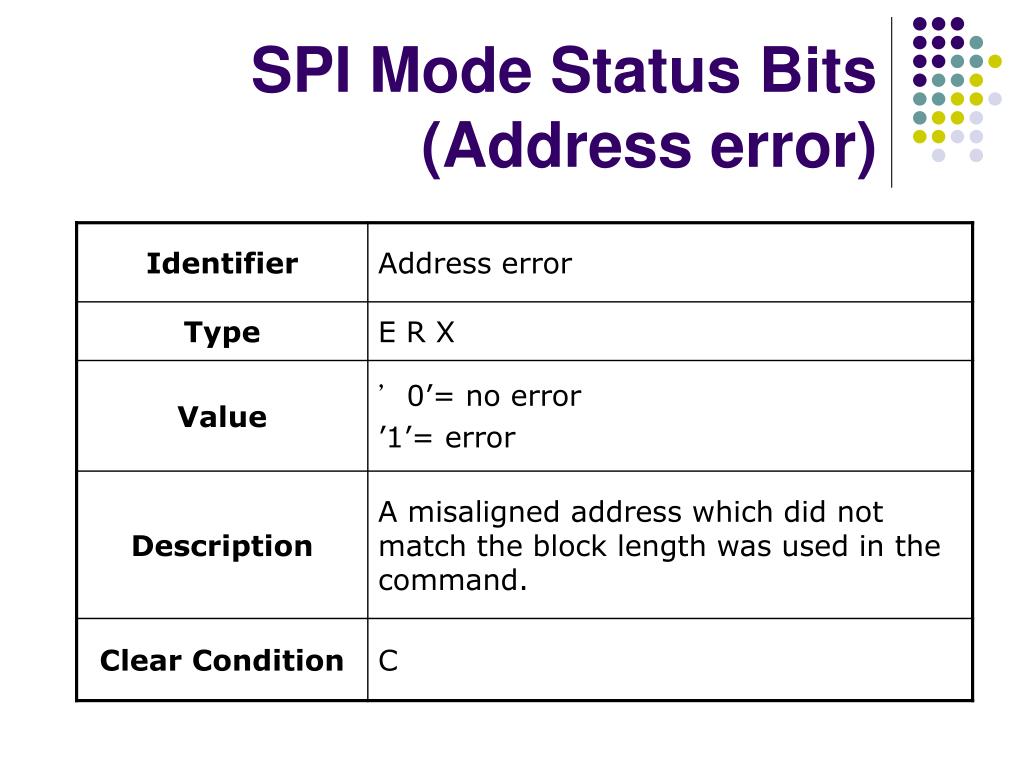 Format of Response R1 Address error: A misaligned address that did not match the block length was used in the command. Parameter error: The command’s argument (e.g. address, block length) was outside the allowed range for this card.