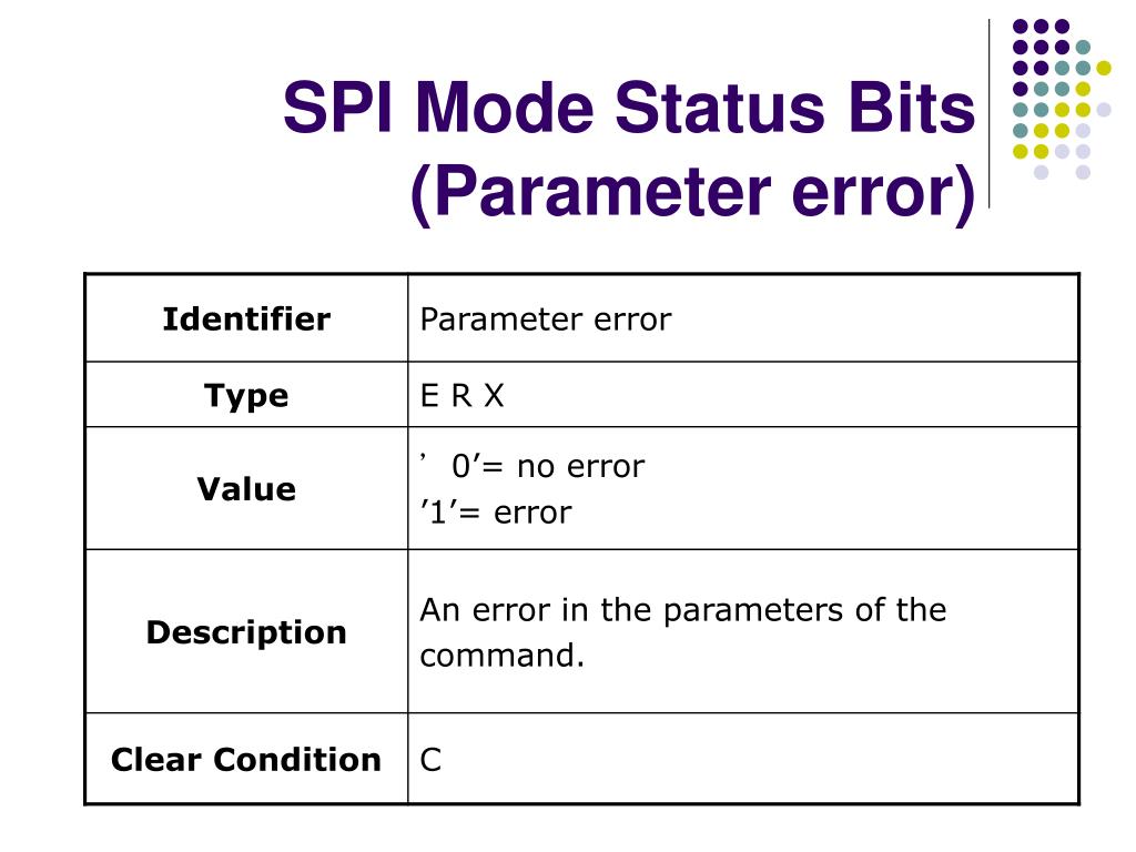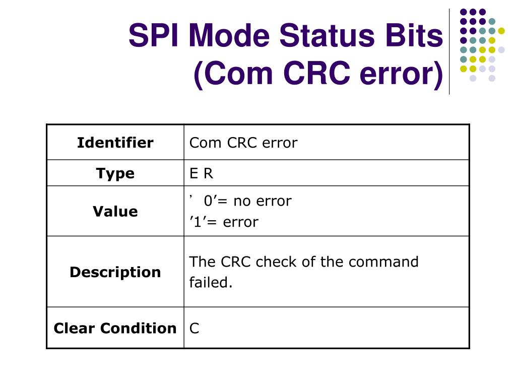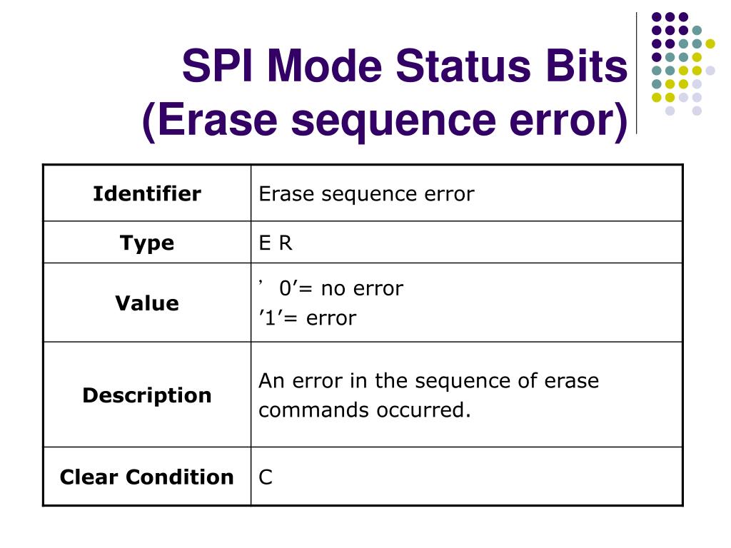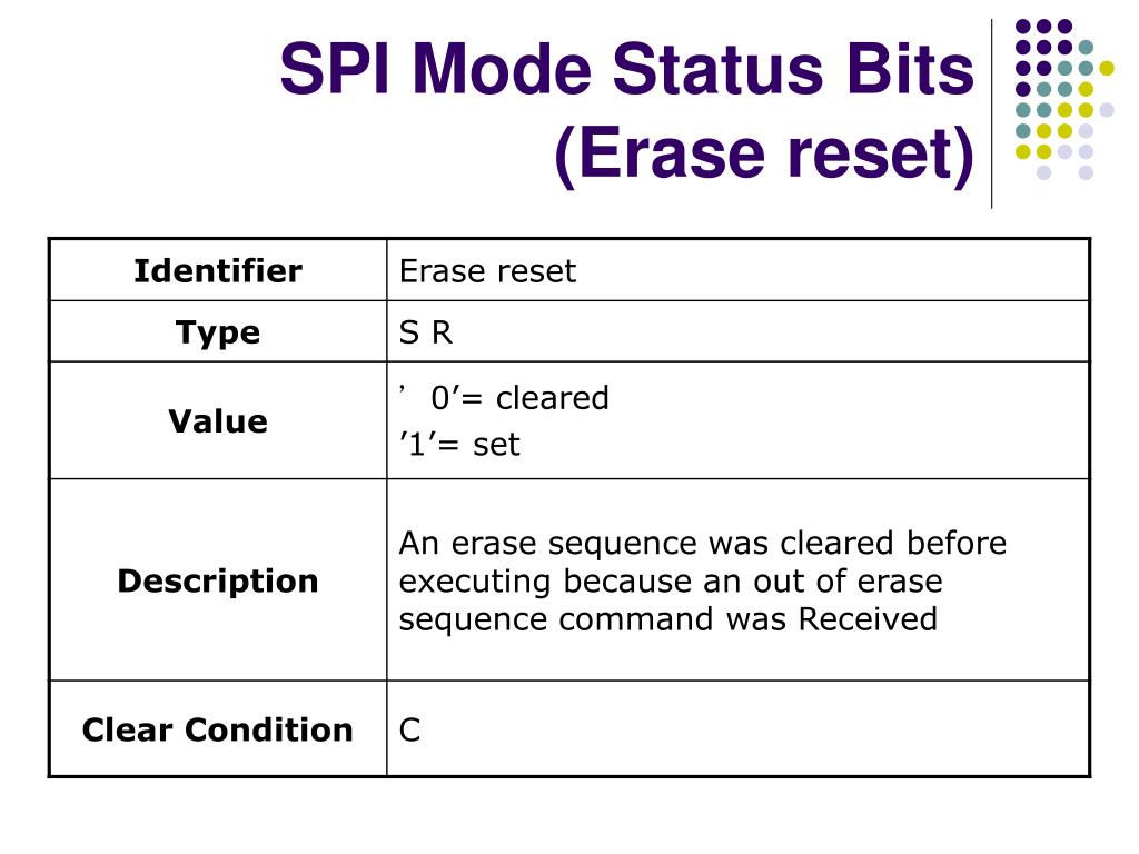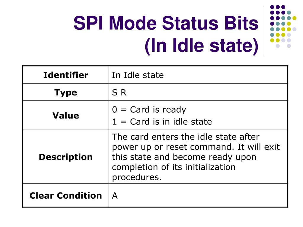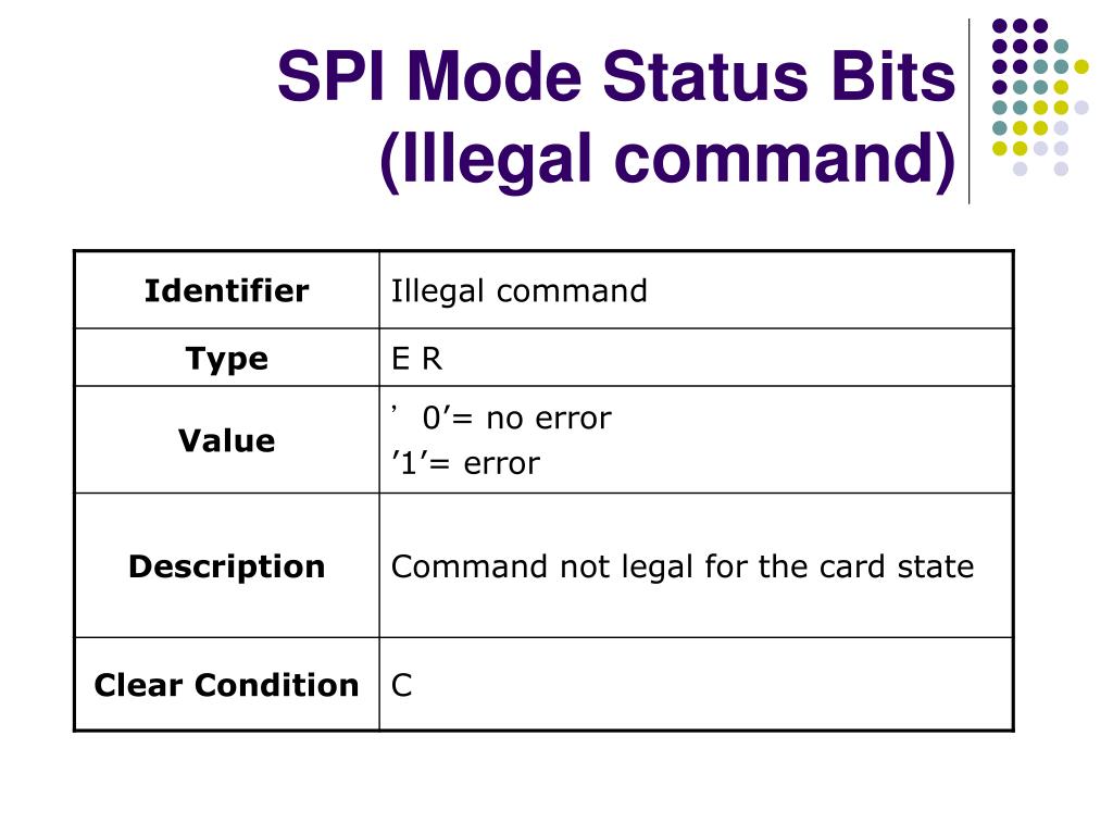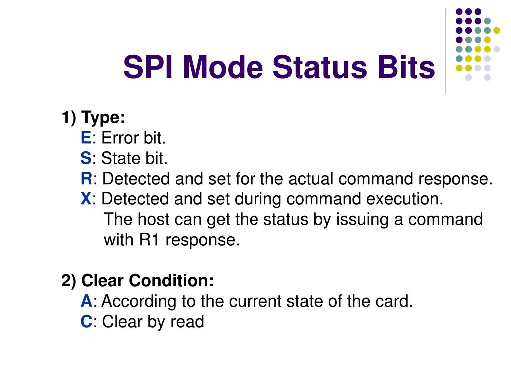 SPI Mode Status Bits 1) Type: E: Error bit. S: State bit. R: Detected and set for the actual command response. X: Detected and set during command execution. The host can get the status by issuing a command with R1 response. 2) Clear Condition: A: According to the current state of the card. C: Clear by read