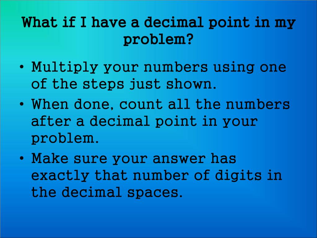 What if I have a decimal point in my problem? • Multiply your numbers using one of the steps just shown. • When done, count all the numbers after a decimal point in your problem. • Make sure your answer has exactly that number of digits in the decimal spaces.