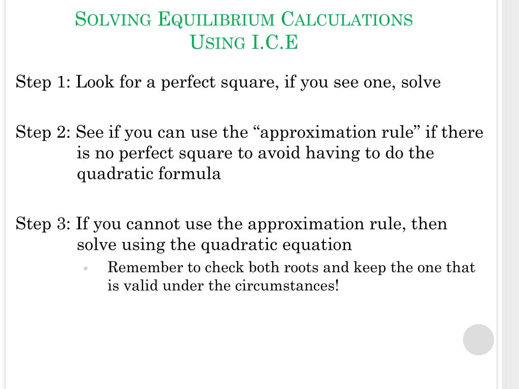 Solving Equilibrium CalculationsUsing I.C.E Step 1: Look for a perfect square, if you see one, solve Step 2: See if you can use the “approximation rule” if there is no perfect square to avoid having to do the quadratic formula Step 3: If you cannot use the approximation rule, then solve using the quadratic equation • Remember to check both roots and keep the one that is valid under the circumstances!