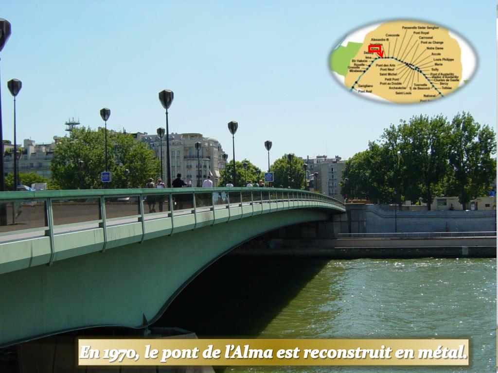 Le Pont de l’Alma Napoléon III lui a donné le nom de sa première victoire en Crimée (Ukraine). Le zouave représente les soldats héros de cette bataille. Le zouave indique le niveau des crues de la Seine. Il est construit en pierre pour la première exposition universelle de 1855. En 1970, le pontde l’Alma est reconstruit en métal.