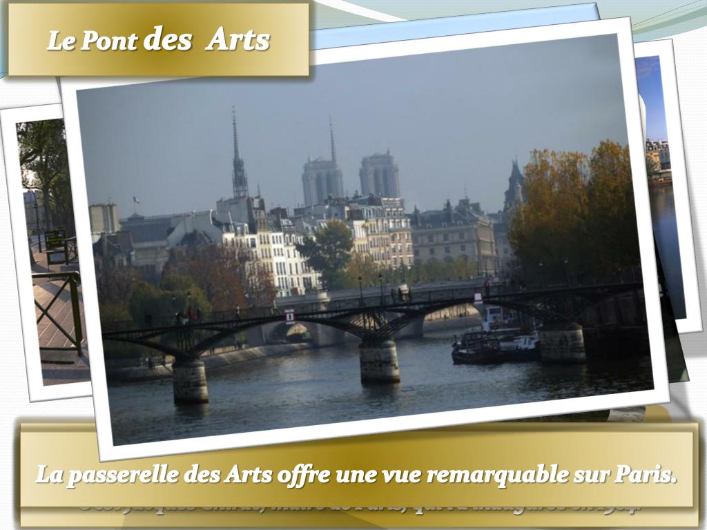 Le Pont des Arts Fermée en 1970, la passerelle a été reconstruite en acier. C’est Jacques Chirac, maire de Paris, qui l’a inaugurée en 1984. La passerelle des Arts offre une vue remarquable sur Paris. Ce pont réservé aux piétons relie l'Institut de France au Louvre Des couples du monde entier y fixentdes cadenasgravés à leursnoms et jettentla clédans la Seine. Il est le pont le plus romantique de Paris