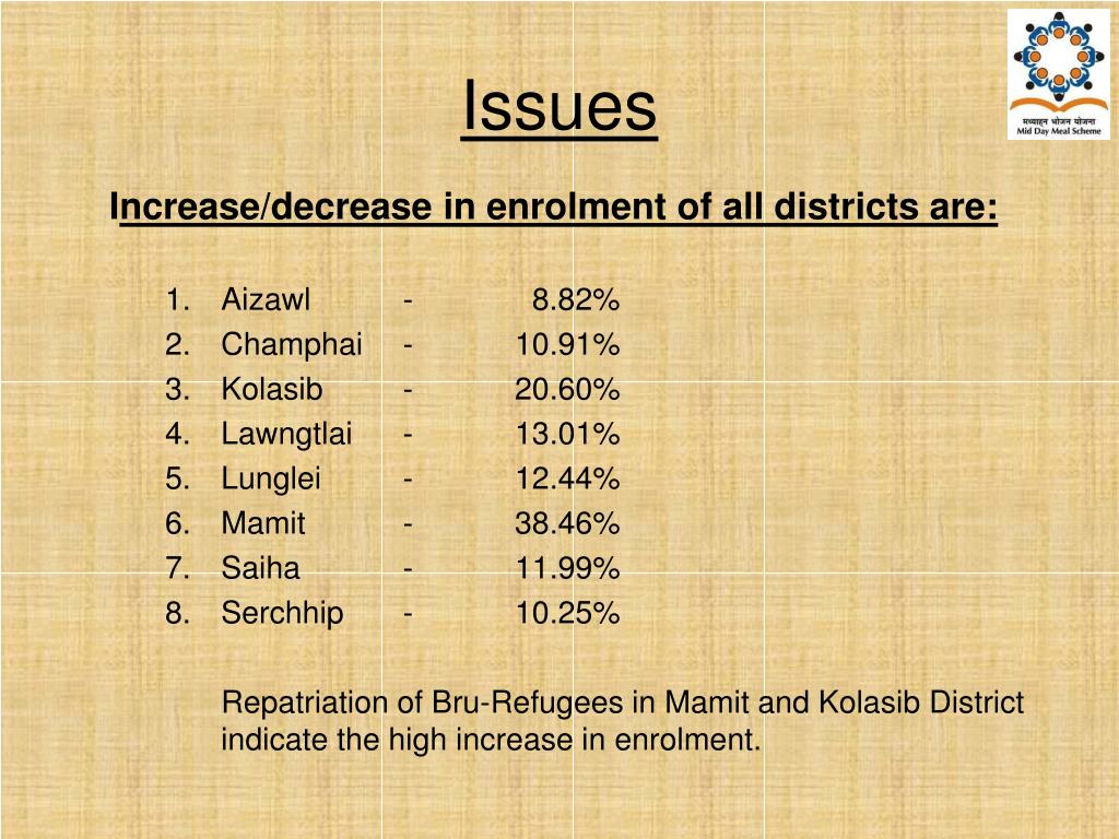 Issues Increase/decrease in enrolment of all districts are: • Aizawl - 8.82% • Champhai - 10.91% • Kolasib - 20.60% • Lawngtlai - 13.01% • Lunglei - 12.44% • Mamit - 38.46% • Saiha - 11.99% • Serchhip - 10.25% Repatriation of Bru-Refugees in Mamit and Kolasib District indicate the high increase in enrolment.