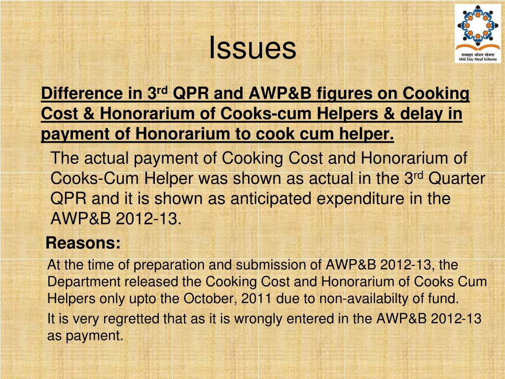 Issues Difference in 3rd QPR and AWP&B figures on Cooking Cost & Honorarium of Cooks-cum Helpers & delay in payment of Honorarium to cook cum helper. The actual payment of Cooking Cost and Honorarium of Cooks-Cum Helper was shown as actual in the 3rd Quarter QPR and it is shown as anticipated expenditure in the AWP&B 2012-13. Reasons: At the time of preparation and submission of AWP&B 2012-13, the Department released the Cooking Cost and Honorarium of Cooks Cum Helpers only upto the October, 2011 due to non-availabilty of fund. It is very regretted that as it is wrongly entered in the AWP&B 2012-13 as payment.
