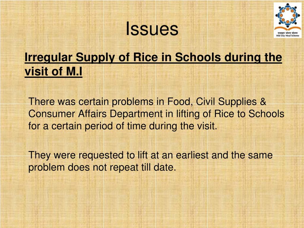 Issues Irregular Supply of Rice in Schools during the visit of M.I There was certain problems in Food, Civil Supplies & Consumer Affairs Department in lifting of Rice to Schools for a certain period of time during the visit. They were requested to lift as an earliest and the same problem does not repeat till date.