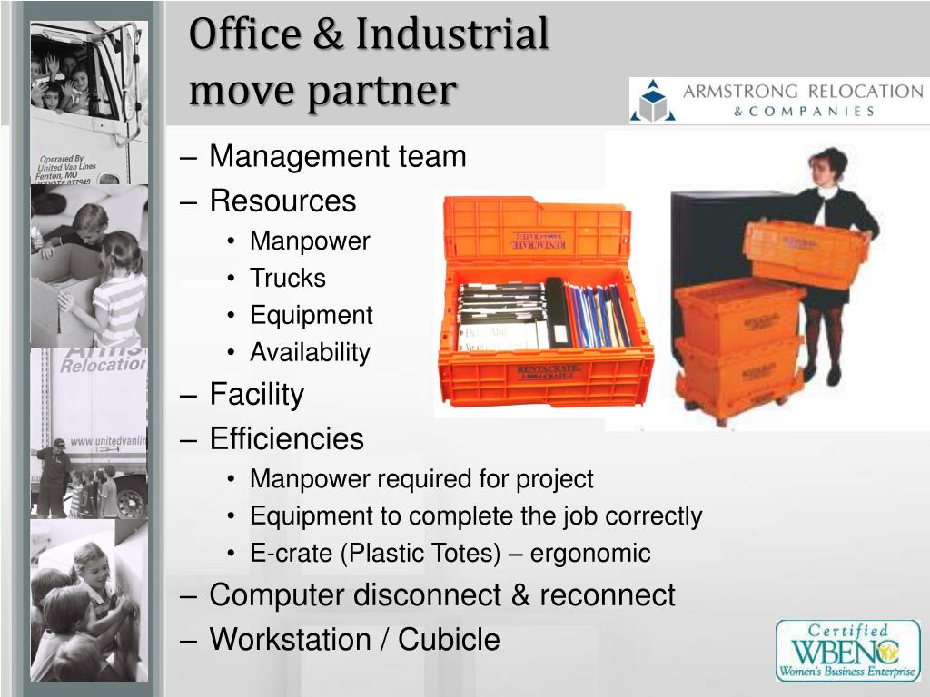 Office & Industrial move partner • Management team • Resources • Manpower • Trucks • Equipment • Availability • Facility • Efficiencies • Manpower required for project • Equipment to complete the job correctly • E-crate (Plastic Totes) – ergonomic • Computer disconnect & reconnect • Workstation / Cubicle