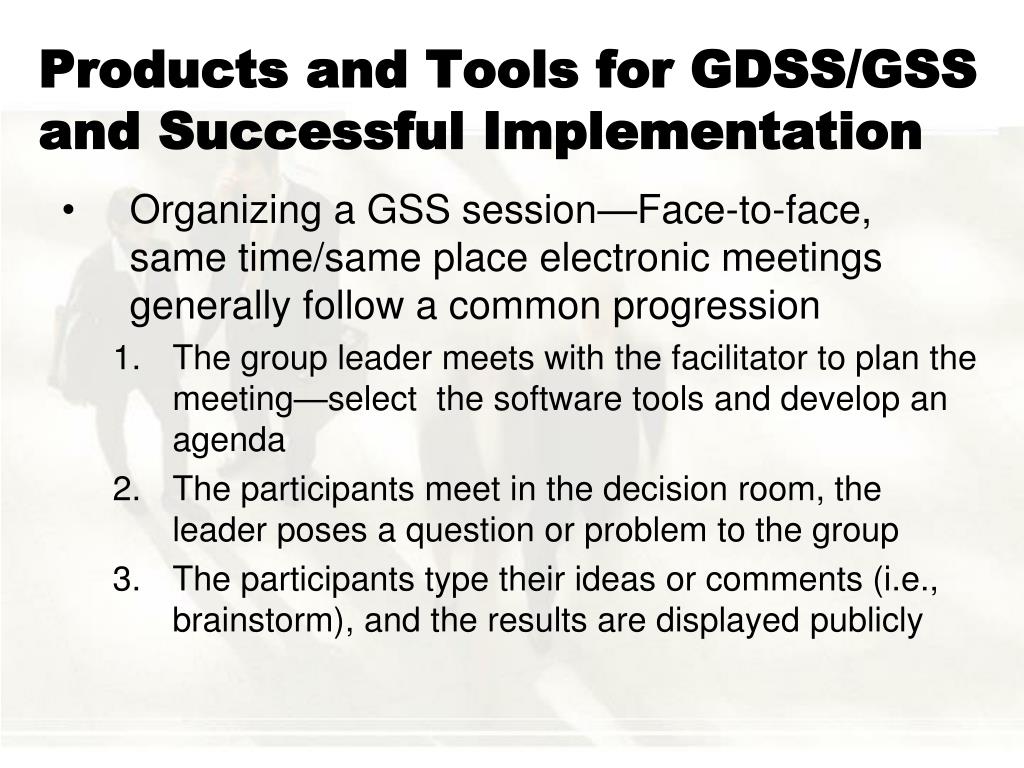 Products and Tools for GDSS/GSS and Successful Implementation • Organizing a GSS session—Face-to-face, same time/same place electronic meetings generally follow a common progression • The group leader meets with the facilitator to plan the meeting—select the software tools and develop an agenda • The participants meet in the decision room, the leader poses a question or problem to the group • The participants type their ideas or comments (i.e., brainstorm), and the results are displayed publicly