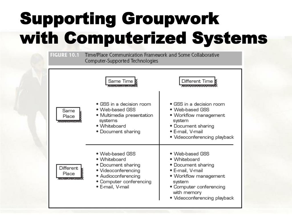 Supporting Groupwork with Computerized Systems • Overview of computerized support for groupwork • The Web supports intra- and interorganizational collaborative decision making through collaboration tools and access to data, information, and knowledge from inside and outside the organization