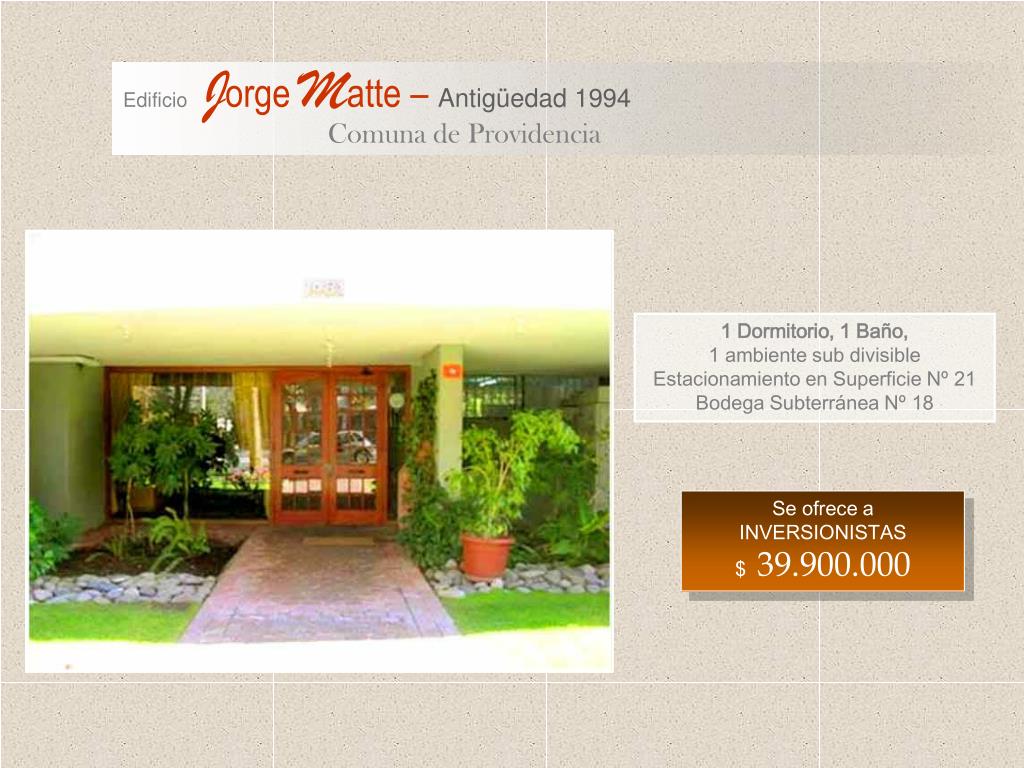 Edificio J orge M atte – Antigüedad 1994 Comuna de Providencia. 1 Dormitorio, 1 Baño, 1 ambiente sub divisible Estacionamiento en Superficie Nº 21 Bodega Subterránea Nº 18. Se ofrece a INVERSIONISTAS $ 39.900.000. Edificio Jorge Matte