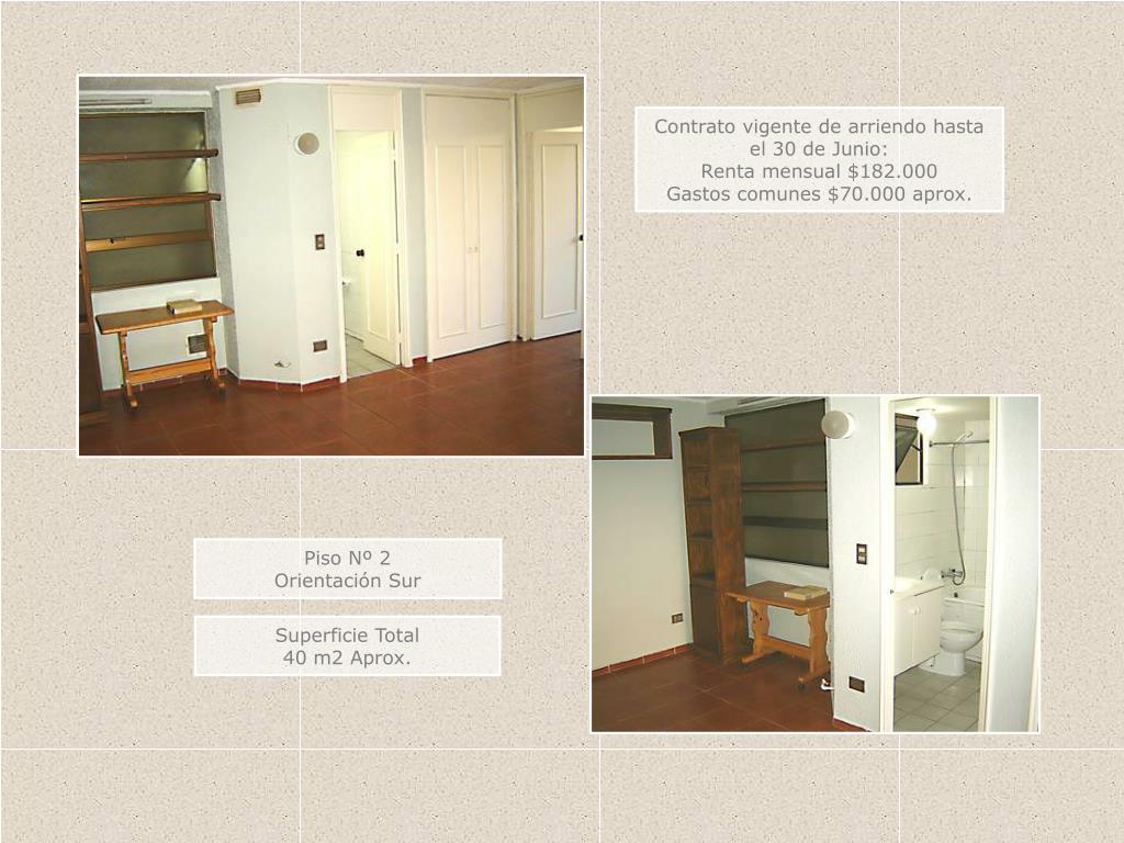 Contrato vigente de arriendo hasta el 30 de Junio: Renta mensual $182.000 Gastos comunes $70.000 aprox. Piso Nº 2 Orientación Sur Superficie Total 40 m2 Aprox.