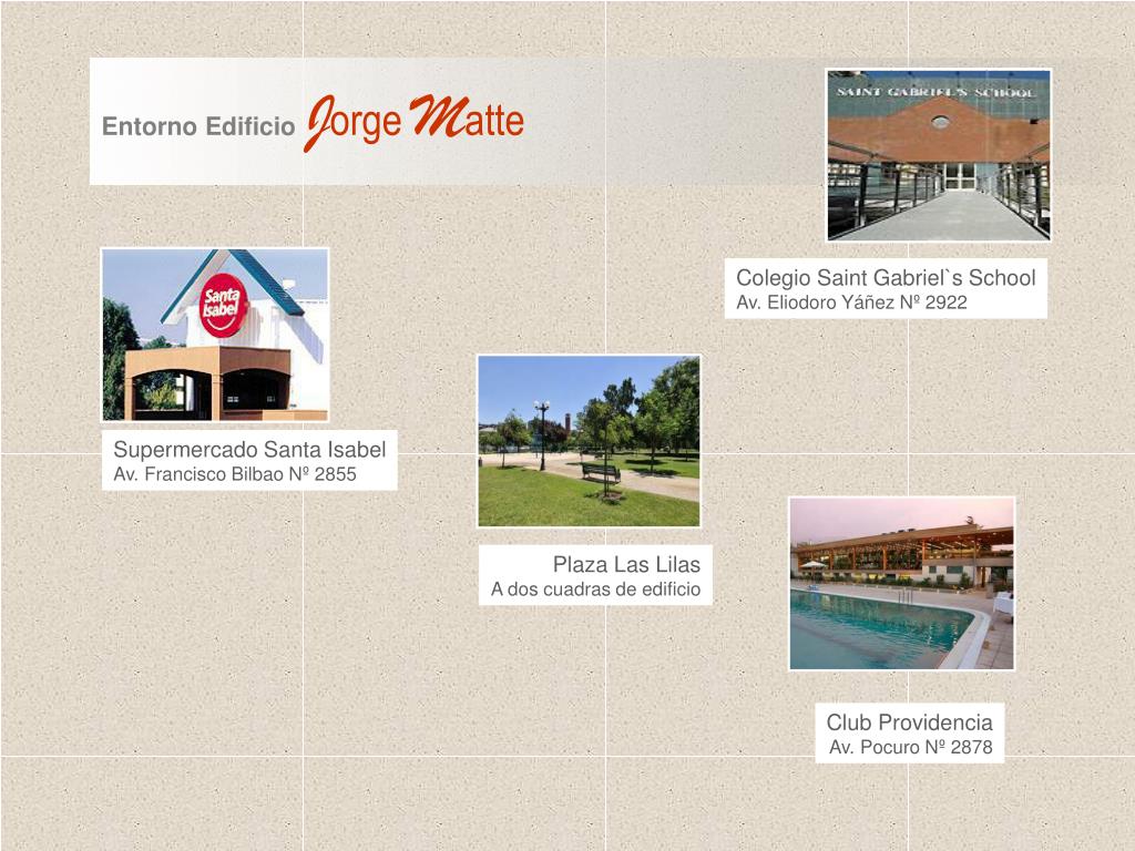 Entorno EdificioJorge Matte Colegio Saint Gabriel`s School Av. Eliodoro Yáñez Nº 2922 Supermercado Santa Isabel Av. Francisco Bilbao Nº 2855 Plaza Las Lilas A dos cuadras de edificio Club Providencia Av. Pocuro Nº 2878