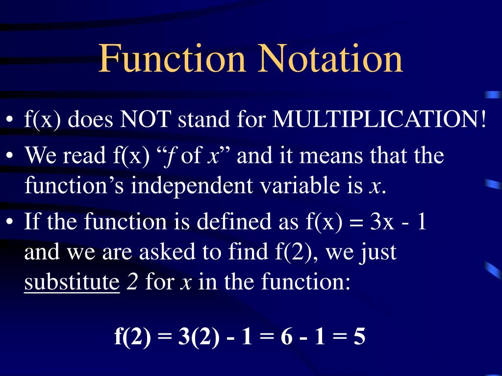 Function Notation • f(x) does NOT stand for MULTIPLICATION! • We read f(x) “f of x” and it means that the function’s independent variable is x. • If the function is defined as f(x) = 3x - 1and we are asked to find f(2), we just substitute2 for x in the function: f(2) = 3(2) - 1 = 6 - 1 = 5