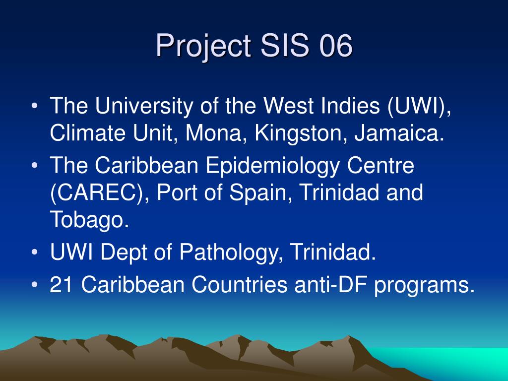 Project SIS 06 • The University of the West Indies (UWI), Climate Unit, Mona, Kingston, Jamaica. • The Caribbean Epidemiology Centre (CAREC), Port of Spain, Trinidad and Tobago. • UWI Dept of Pathology, Trinidad. • 21 Caribbean Countries anti-DF programs.