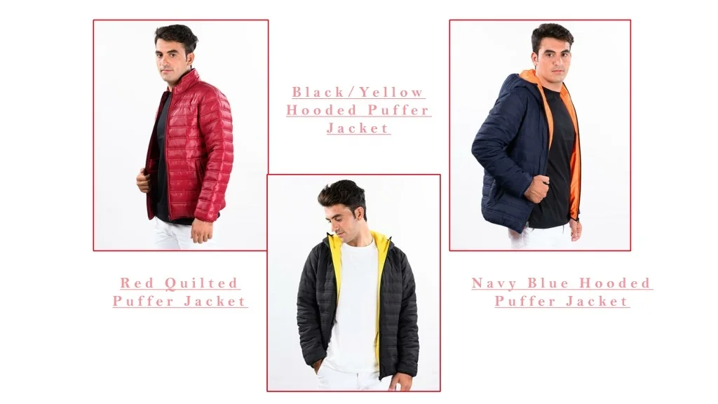 B l a c k / Ye l l o w H o o d e d P u f f e r J a c k e t R e d Q u i l t e d P u f f e r J a c k e t N a v y B l u e H o o d e d P u f f e r J a c k e t